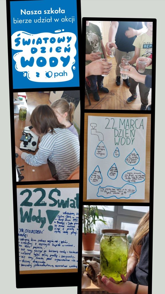W tym tygodniu w naszej szkole obchodziliśmy Światowy Dzień Wody. Lekcje edukacji zdrowotnej i biologii rozpoczynaliśmy od wypicia kubka wody (serdecznie dziękujemy Mamie Szymona z klasy 6, Pani Marzenie, za ich zakup).