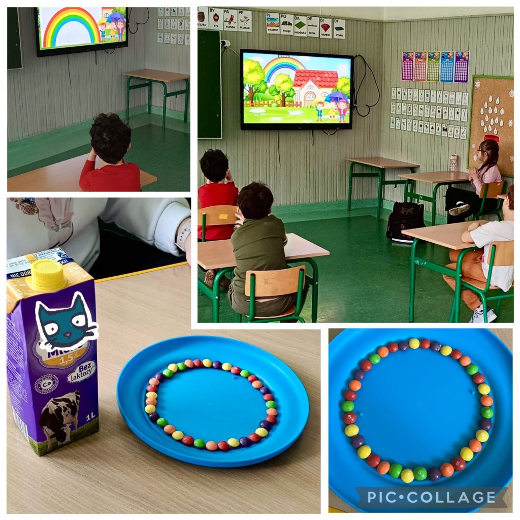 Najpierw obejrzeli krótki filmik o tym, jak powstaje tęcza – dowiedzieli się, że światło może się rozszczepiać na wiele barw i dlatego na niebie widzimy kolorowy łuk. ![]()