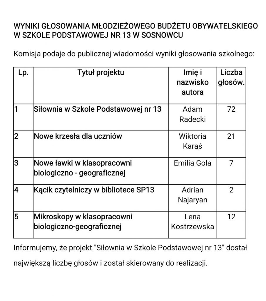 Wyniki głosowania w Młodzieżowym Budżecie Obywatelskim Wyniki głosowania w Młodzieżowym Budżecie Obywatelskim 10 grudnia 2025 SP13